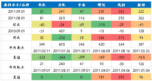 據(jù)MRI成本模型測算,截止2011年9月1日,線材、螺紋、冷軋、鍍鋅四品種的平均盈利空間仍在200元/噸以上,而中板、熱軋偏弱,均不到50元/噸。與2011年8月1日相比,各品種盈利水平環(huán)比紛紛回落。其中冷軋、線材回落幅度較小,而螺紋盈利水平則明顯收窄,縮水115元/噸。與2010年9月1日相比,長材依然表現(xiàn)搶眼,螺紋、線材盈利水平同比增幅均超過260元/噸,而板材各品種均不過百元大關(guān),另冷軋同比更是下降216元/噸。