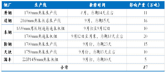 8月中旬日均粗鋼產(chǎn)量為194.7萬噸,環(huán)比上旬繼續(xù)增加。據(jù)Mysteel調(diào)查,9月份鋼廠的中厚板訂單雖盈利情況仍不容樂觀,但較前期有所好轉(zhuǎn)。另8-9月份,鋼廠為限產(chǎn)保價,紛紛加大了檢修力度,尤其是熱軋產(chǎn)線。分品種來看,由于檢修影響熱軋產(chǎn)量約為87萬噸,影響建材產(chǎn)量為30萬噸左右,影響中厚板產(chǎn)量則為25萬噸左右,供給壓力得到明顯緩解。