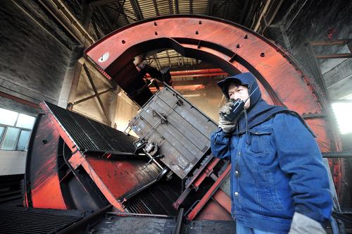 10月11日,在蘭州鐵路局武威南車務(wù)段金昌電廠鐵路專用線,一名工作人員在操作轉(zhuǎn)子卸煤機(jī)對(duì)運(yùn)送電煤的車廂進(jìn)行卸煤作業(yè)。