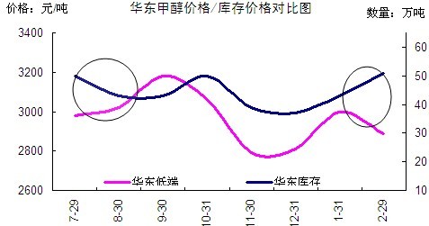 從圖中可以看出,自元旦之后,港口地區(qū)庫存開始上升,且在春節(jié)之后增幅有所擴大。截止2月底,該地庫存已達50萬噸以上。進入2月份的第二周,港口逼倉現象嚴重,一部分甲醇產品自身庫存上升,另一部分主要源自于化工產品之間的“爭罐”現象。2月15日,華東地區(qū)價格達到年后低點,江蘇成交頻臨2800元/噸。