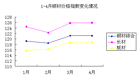 受雙節集中影響,1月份國內鋼材市場需求減弱,庫存增多,鋼材價格出現下滑;2月份,市場需求未見明顯增長,鋼材價格繼續下行,CSPI綜合價格指數降至118.47點;3月份開始受季節性需求回暖的影響,鋼材價格出現小幅度上調,CSPI綜合價格指數一度升至121.18點;4月份,鋼材價格升幅減小,CSPI綜合價格指數達到121.19點。