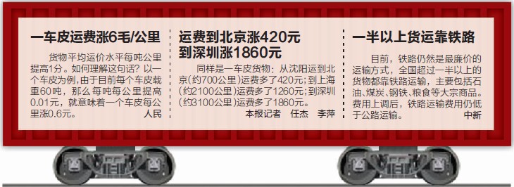 2003年以來,國家曾7次上調鐵路貨運價格,最近一次為去年4月。據悉,此次調整幅度是上一次的5倍。去年4月,國家將鐵路貨物運營價格由平均每噸公里7.01分提高到7.21分。而此次,貨物平均運價水平每噸公里提高了1分,是上次調整的5倍。本次調整之后,每噸公里的運價隨即提高到8.21分。