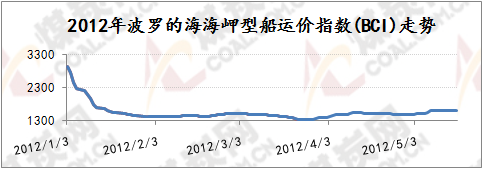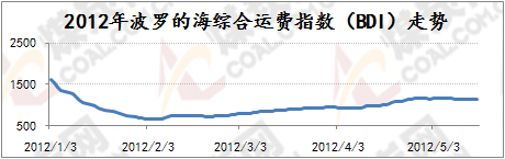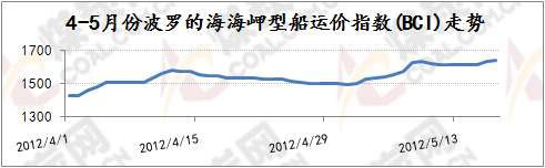 波羅的海海岬型指數BCI主要反映煤炭與鐵礦石的貿易狀況,2011年年底,隨著煤炭和鐵礦石等大宗散貨運輸冬儲的完成,海運市場日趨冷清,BCI跌勢相較BDI更猛,2012年年初下行至2955點,比2011年12月份高點下跌700點,下跌幅度達到20.7%,2012年1月末再度急劇下行1508點至1447點,此后至今波羅的海海峽型船運價指數BCI一直在低位維持低迷震蕩的局勢,反彈無力。國際海運費持續低迷震蕩的原因如上所述根本上受世界經濟不景氣影響大宗商品交易量下降,國際煤炭、鐵礦石總體需求持續低位尤其是中國方面的煤炭、鐵礦石需求相對低位,4月份中國鐵礦石進口量連續2個月回落,鐵礦石價格也隨著鋼材價格的不斷下挫而持續陰跌,很大程度上影響了國際航運市場,而國際航運市場也因為大宗商品貿易量的下降而呈現“運力過剩”的狀況,后期即使到了5月份國際海運費也難有反彈動力,維持低位漲跌震蕩為主。