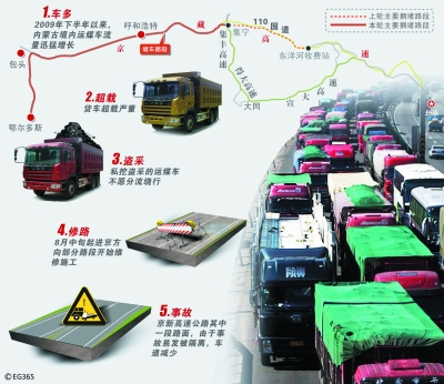 但實(shí)際上,貨車的長(zhǎng)期嚴(yán)重超載才是問題的根結(jié)。由于京藏高速公路北京段(原八達(dá)嶺高速)彎急、長(zhǎng)下坡多,群死群傷交通事故時(shí)有發(fā)生,出于安全考慮,2006年起此路段已禁止核載4噸以上的貨車通行。大貨車只能通過110國(guó)道進(jìn)京,而長(zhǎng)期超載又使得這條剛剛建成通車才兩年多的道路就出現(xiàn)了多處路面嚴(yán)重破損的情況,道路施工直接影響到后方高速路上車輛的行進(jìn)速度。