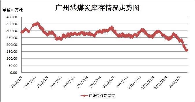 庫存方面,本周廣州庫存繼續此前的下滑趨勢,港口庫存最低突破160萬噸關口,截止1月20日廣州港煤炭庫存總計158.79萬噸,其中新沙公司102萬噸,西基公司30萬噸,新港公司8.56萬噸,黃埔公司18.22萬噸,和上周同期的189.22萬噸相比,廣州港煤炭庫存下滑了30.43萬噸,環比下滑了16.08% 。
