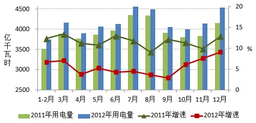 圖1 2011-2012年分月全社會(huì)用電量及其增速統(tǒng)計(jì)圖