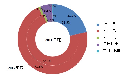 圖4 2011、2012年底發(fā)電設(shè)備容量結(jié)構(gòu)圖