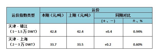 此表包含中國沿海(散貨)運價指數-煤炭(天津港航線)運價指數的本期和上期數,以及同比增減。