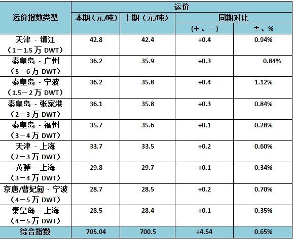 此表包含中國沿海運價指數-煤炭運價指數的本期和上期數,以及同比增減。