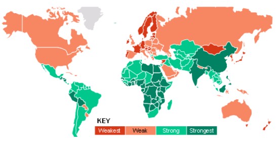 全球各國能源需求增長地圖(深紅為最少,深綠為最多)