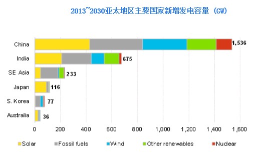 這相當于在亞太地區相關領域投入3.6萬億美元的資金 。煤電及天然氣發電等化石燃料發電在該地區仍將持續增長,盡管各方面對由此引發的污染和氣候變化問題的擔憂越來越深;而最大的增長將來自于可再生能源——預計從現在到2030年,該領域將吸引2.5萬億美元的投資,裝機容量將增加1,700吉瓦。