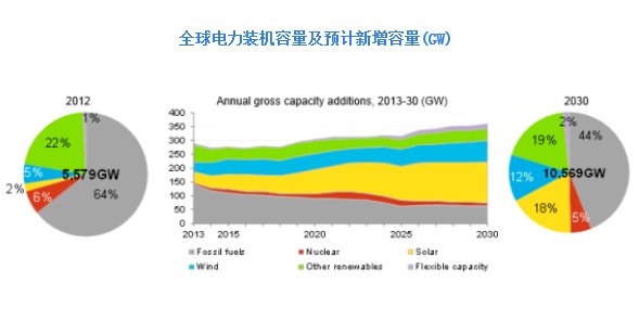 到2030年,化石燃料發電將仍占有全球電力裝機容量的最大份額,達到44%,相比2013年的64%有一定程度的下降。今后16年內,全球煤電、天然氣發電和燃油發電將總共新建約1,073吉瓦的裝機容量,這其中不包括更新換代舊的火電廠。新建火電裝機容量中,絕大多數將是發展中國家為滿足工業化發展帶來的電力需求增長而建,同時也有為平衡風電、光伏發電等非穩定輸出型電源而建的設施。到2030年,光伏和風電在全球電力裝機容量中所占的總份額將由去年的3%升至16%。