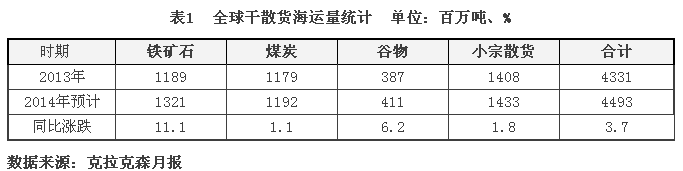 今年全球經濟復蘇仍將是脆弱和不平衡的。烏克蘭地緣政治危機將對歐洲經濟造成沖擊,國際油價大幅回落,俄羅斯經濟也面臨下行壓力。國際貨幣基金組織預計今年全球經濟增速為3.8%,國際干散貨海運貿易量增幅繼續收窄。克拉克森預計,今年全球干散貨海運量為46.59億噸,同比增長3.7%(見表3)。