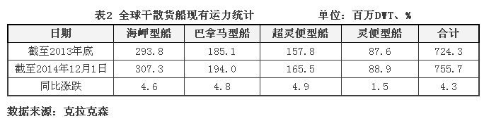去年全球干散貨運力拆解量延續2013年的下滑走勢,前11月共拆解1460萬DWT,同比減少580萬DWT。其中,巴拿馬型和超靈便型船的拆解量相對較高;海岬型船拆解420萬DWT,同比減少350萬DWT;巴拿馬型船共拆解410萬DWT,同比增加10萬DWT。