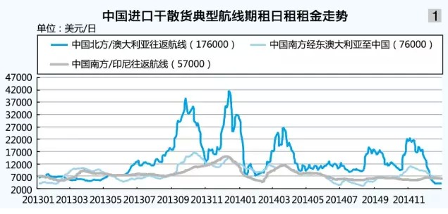去年海岬型船市場運價呈波浪式震蕩,振幅縮小。全年走出三波上漲行情,上半年在礦商加快出貨步伐以及市場炒作影響下,一改2013年低位平穩運行走勢,2月下旬至3月下旬海岬型船日租金大幅上漲。下半年,鐵礦石價格持續下跌,8月中旬至9月中旬、10月下旬至11月中旬,鐵礦石船運活動升溫,與2013年一樣走出兩輪上漲行情,但上漲幅度小,持續時間短。隨著國際油價大幅回落,中國經濟放緩,海岬型船提早進入低迷慘淡行情,日租金跌至2013年以來最低。去年年底,中國北方至澳大利亞往返航線日租金為4050美元,較年初下跌85.9%;全年平均13138美元,同比下跌9.3%。
