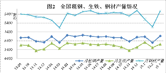 2015年3月,全國共生產粗鋼6948.49萬噸、生鐵6024.75萬噸、鋼材9755.88萬噸,其中納入中國鋼鐵工業協會月報統計的會員鋼鐵企業共生產粗鋼5205.56萬噸、生鐵5262.93萬噸、鋼材5105.21萬噸,分別占全國粗鋼產量的74.92%、全國生鐵產量的87.36%、全國鋼材產量的52.33%。