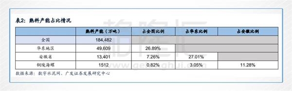 安徽是我國最大的熟料生產基地,2016年時熟料的產量位居全國的首位,在華東地區的熟料產能占比也高達27%。其中,安徽省的主要水泥產能地有銅陵,其熟料產能占全省比例的11%。