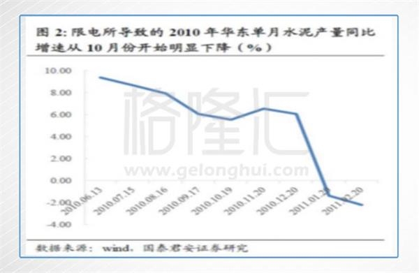 2010年7月至年底,為了完成當時“十一五”的節能減排目標,各地陸續發布措施以應對節能減排的考核,拉閘限電是最重要的行政手段。水泥作為耗電的大戶,自然也就成為拉閘首當其沖的行業之一。其中,華東地區是被限電的最主要區域。上圖是2010年華東區的熟料產量數據,可以看到限電期間產量增速下滑明顯。