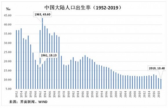 2019年出生率降至10.48‰,不過,與2018年相比,2019年出生人口減少的數量較有顯著下降。2019年全年出生人口比2018年減少58萬人,而2018年比2017年減少200萬人。