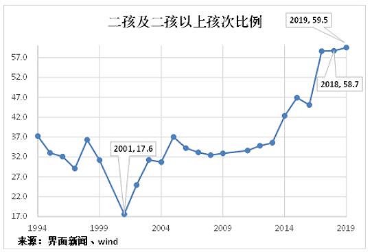 統計局抽樣調查顯示,在出生人口中,二孩及以上孩次比例達到59.5%,較2018年繼續上升了0.8個百分點,再次創下新高。與“單獨二孩”政策實施前的2012年相比,上升了24個百分點。