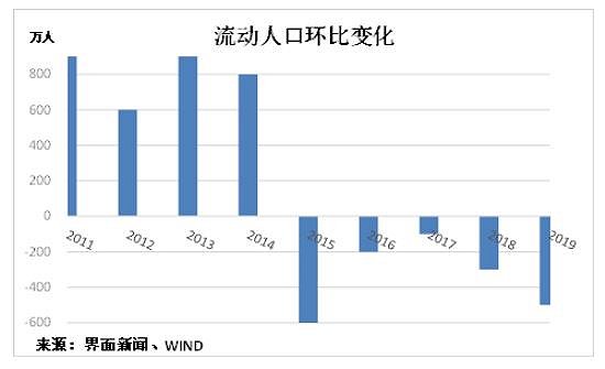 二是2019年流動人口減少515萬,較2018年多減200萬,也是本輪戶籍改革以來連續第5年減少,2015-2019年合計減少數已經超過了1700萬。(流動人口是指人戶分離人口中不包括市轄區內人戶分離的人口。)