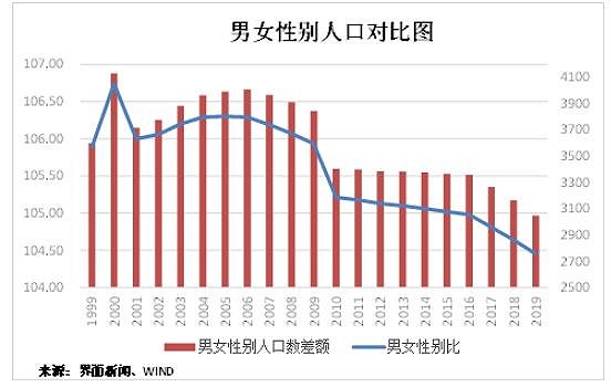 三是2019年性別比進一步下降至104.45(以女性為100),這是自2006年以來連續第14年下降,盡管男女性別人口的差額仍然達到3000萬,但與高峰時期相比,已經減少了1000萬。
