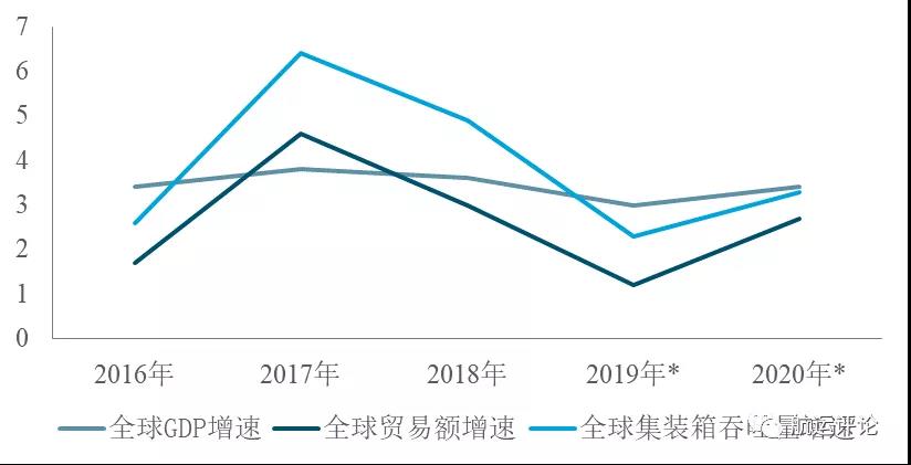 注:*表由IMF、WTO、Drewry官網預測數據來源:IMF、WTO、Drewry官網圖1 2016年-2019年全球GDP增速、全球貿易額增速、全球集裝箱吞吐量增速