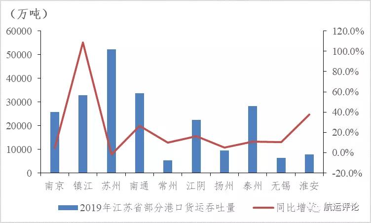 2019年中國內河港口貨物吞吐量表現強勁,全國港口完成貨物吞吐量47.6億噸,同比增長19.4%,與去年增速相比大幅增長。自2019年一季度起,中國內河港口吞吐量就保持15%以上的強勁增速,主要由于長江內河對“黑碼頭”的整治,貨源集中至長江沿線大港,促進港口吞吐量大幅上漲。江蘇省是全國內河港口大省,內河港口貨物吞吐量約占全國的53%,隨著江蘇省港口資源整合的進一步推進,以南京港、蘇州港為首的江蘇省港口群不斷強化營銷網絡、優化航線布局,進一步釋放一體化改革紅利,2019年江蘇省港口內河貨物吞吐量得以大幅增長,完成貨物吞吐量25億噸,同比增長18%。其中,鎮江港港口貨物吞吐量增速與去年相比翻番,主要由于今年基建、房地產投資增速漲勢良好,鎮江港礦物性建筑材料實現大幅增長,提振港口貨物吞吐量上漲。