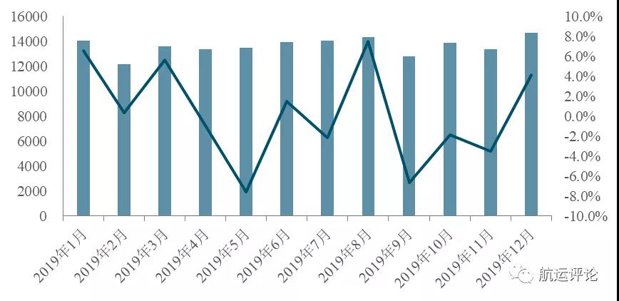 洛杉磯港作為美西的主要港口,2019年共完成968.8萬TEU,同比下降1.3%。其中第四個季度增速出現大幅下跌,10月份完成集裝箱吞吐量同比下降19.1%至77萬標準箱。11月份進口量較去年同期下降12.2%至37.1萬標準箱,出口下降9.2%至13.9萬標準箱,已連續第13個月下降,11月份共完成集裝箱吞吐量72.9萬標準箱,同比下降12.4%。12月份共完成集裝箱吞吐量74.7萬標準箱,同比下降17.3%。主要原因是中美貿易戰對洛杉磯港集裝箱貿易業務造成嚴重破壞和去年同期提前搶運貨物使得2018年集裝箱量基數大。