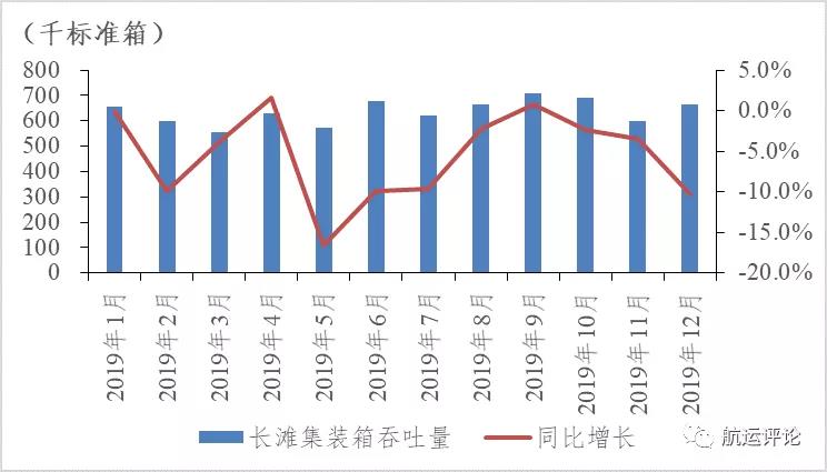 2019年,長灘港共完成763.2萬標準箱,同比下降5.7%。由于限制性關稅繼續拖累港口供應鏈,今年以來長灘港集裝箱吞吐量增速除了4月份和9月份保持1.6%和0.8%的較低增速外,其他月份均處于負增長區間。其中5月份、6月份、10月份增速跌破-10%。可見關稅嚴重阻礙跨太平洋貿易。