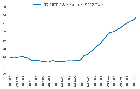 第二,降低商品房的預售條件,便利房企銷售回款。2017年四季度期房銷售面積占比開始回升,2019年12月達到了85%。如此高的占比,預售標準調整對房企銷售回款,有著重要影響。因此,在降低購房門檻的同時,也應該降低預售商品房的標準。