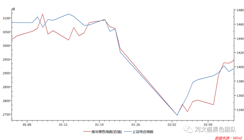 但是這里面仍然會有一點問題,就是黑色表現得過于強烈,因為如果是復工預期整體上對于工業品影響是差不多的,但是在上一周中黑色價格在所有工業品中表現極其亮眼,我們去對比下南華工業品指數(藍色)和南華黑色指數,可以明顯的看出黑色出現了超出整體工業品的反彈幅度。那么如果說強刺激是對于整體工業品的,但是市場表現的情況確實差異很大,呈現出黑色一枝獨秀的狀態。那么從這個角度我們可以說黑色品種存在了一定的過熱。