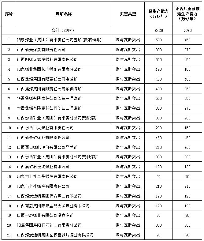 根據《國務院安委會辦公室關于科學確定災害嚴重礦井生產能力防范和遏制煤礦重特大事故的通知》(安委辦〔2020〕28號)、《山西省人民政府安全生產委員會辦公室關于印發〈山西省科學確定災害嚴重礦井生產能力防范和遏制煤礦重特大事故工作方案〉的通知》(晉安辦發〔2020〕18號)和《關于印發〈科學確定“兩類”災害嚴重礦井開采強度評估和生產能力核定實施方案〉的通知》(晉能源煤技發〔2020〕231號),山西省能源局會同山西省應急管理廳、山西煤監局完成了全省39座正常生產的煤與瓦斯突出礦井和沖擊地壓礦井開采強度評估和生產能力重新核定。