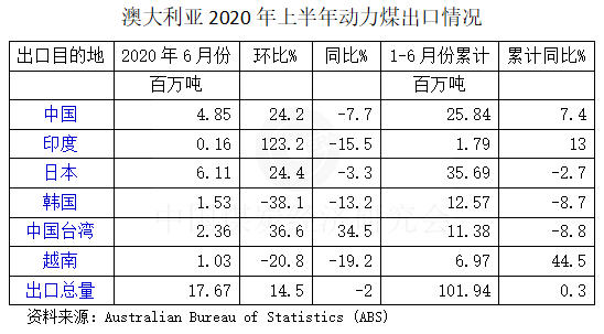 據澳大利亞統計局Australian Bureau of Statistics (ABS)發布的數據顯示, 2020年上半年,澳大利亞動力煤出口1.02億噸,同比增長0.3%。其中,6月份動力煤出口1767萬噸,同比下降2.2%;環比增長14.5%。