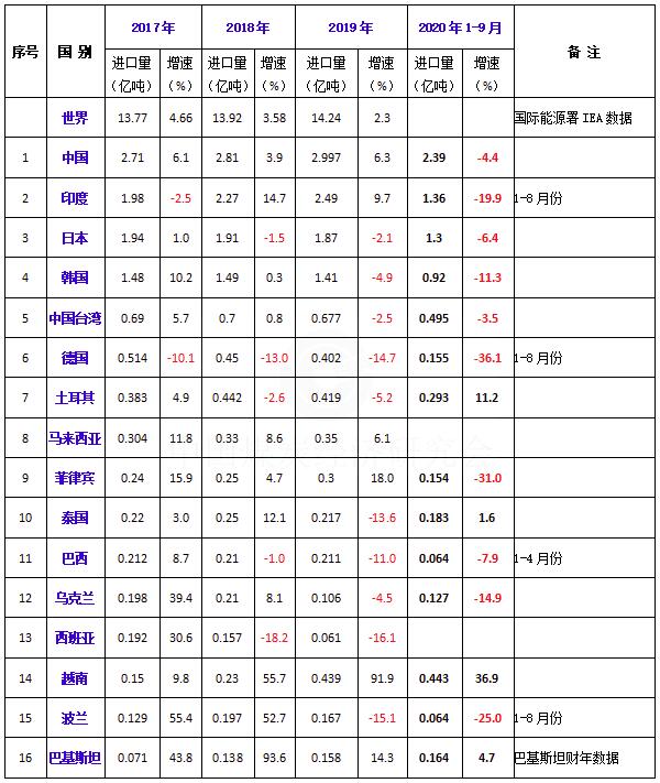 2020年前三季度全球主要煤炭進口國和地區進口情況