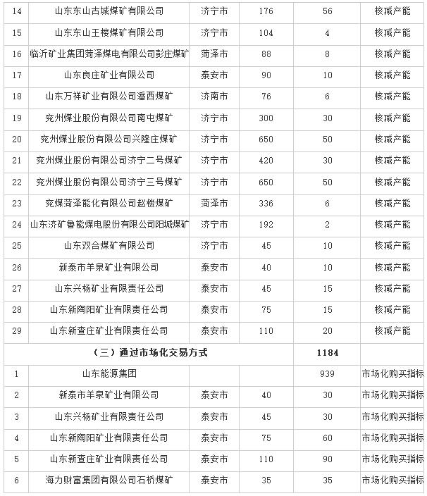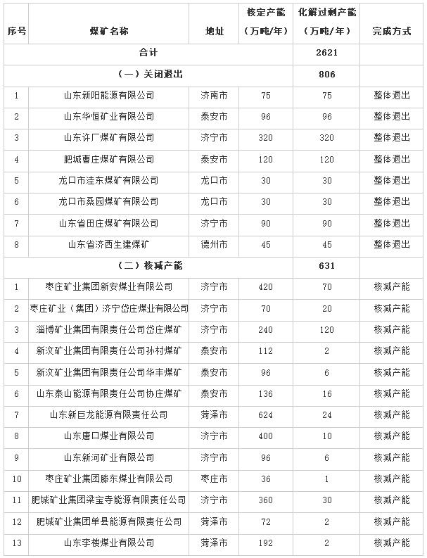 山東省2020年煤炭化解過剩產能完成情況表