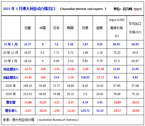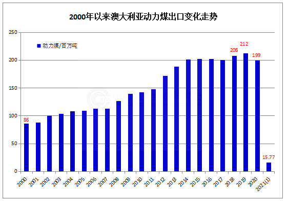 今年1月份,由于受中國非正式限制澳大利亞煤炭進口的持續影響,澳大利亞對中國動力煤出口量仍為零,為自2000年以來的二十多年首次出現的市場現象。
