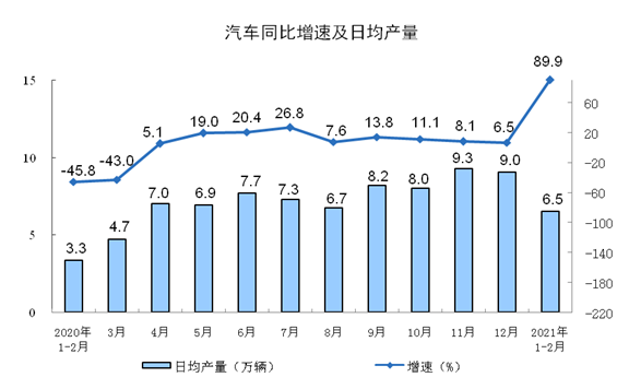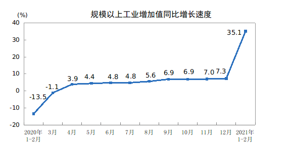1—2月份,規模以上工業增加值同比實際增長35.1 %(以下增加值增速均為扣除價格因素的實際增長率);比2019年1—2月份增長16.9%,兩年平均增長8.1%。從環比看,2月份,規模以上工業增加值比上月增長0.69%。