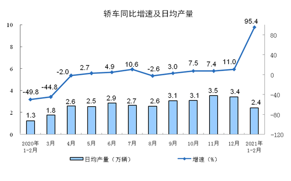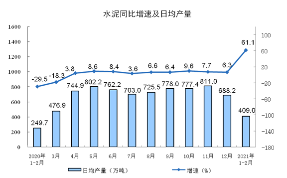 分產品看,1—2月份,612種產品中有565種產品同比增長。鋼材20953萬噸,同比增長23.6%;水泥24129萬噸,增長61.1%;十種有色金屬1056萬噸,增長10.6%;乙烯475萬噸,增長26.7%;汽車385.5萬輛,增長89.9%,其中,新能源汽車31.7萬輛,增長395.3%;發電量12428億千瓦時,增長19.5%;原油加工量11424萬噸,增長15.0%。