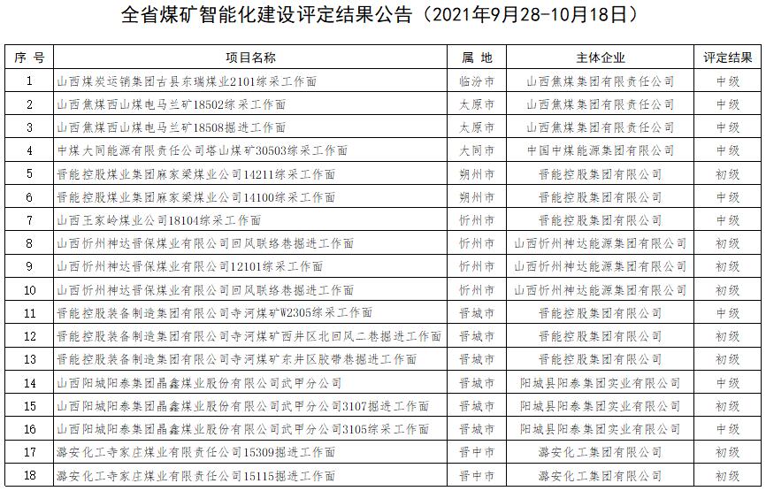 經太原市、大同市、晉城市、朔州市、忻州市、晉中市、臨汾市能源局申請,省能源局按照規定組織專家對山西煤炭運銷集團古縣東瑞煤業2101綜采工作面等18個智能化建設項目進行了現場評定,現將符合《全省煤礦智能化建設基本要求及評分方法(試行)》的智能化項目予以公告。