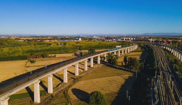 運煤專列行駛在呼和浩特境內(10月15日攝,無人機照片)。