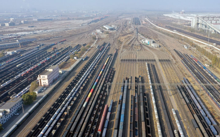 這是包頭西站運煤列車編組場(11月2日攝,無人機照片)。