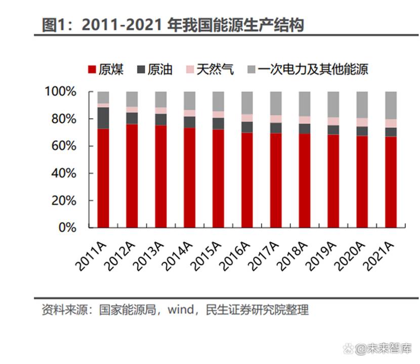 生產(chǎn)的主力 根據(jù)國(guó)家統(tǒng)計(jì)局的數(shù)據(jù),截至 2021 年底,全國(guó)煤炭資源基礎(chǔ)儲(chǔ)量 2078.9 億 噸、石油基礎(chǔ)儲(chǔ)量 36.9 億噸、天然氣基礎(chǔ)儲(chǔ)量 6.34 萬(wàn)億立方米。在不考慮進(jìn)口部 分以及生產(chǎn)、消費(fèi)兩方面增長(zhǎng)的情況下,按照 2021 年的能源消費(fèi)量以及基礎(chǔ)儲(chǔ)量 計(jì)算,煤炭每年約 42.3 億噸的消耗可用時(shí)間約 49 年,石油每年約 7.2 億噸的消 耗可用時(shí)間約 5 年,天然氣每年約 0.37 萬(wàn)億立方米可用時(shí)間約 17 年。“富煤、貧 油、少氣”的資源稟賦一方面決定了中國(guó)在能源革命到來(lái)前,煤炭在國(guó)內(nèi)一次能源 使用中的占比居高不下的狀態(tài);另一方面也凸顯了煤炭對(duì)于中國(guó)能源自給和能源 安全的戰(zhàn)略重要性。