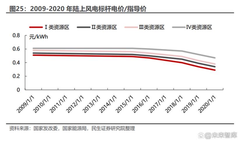 風(fēng)電上網(wǎng)電價(jià)的標(biāo)桿化始于 2009 年,當(dāng)年 7 月 20 日,國(guó)家發(fā)改委發(fā)布《關(guān) 于完善風(fēng)力發(fā)電上網(wǎng)電價(jià)政策的通知》(發(fā)改價(jià)格[2009]1906 號(hào)),按風(fēng)能資源狀況和工程建設(shè)條件,將全國(guó)分為Ⅰ-Ⅳ四類風(fēng)能資源區(qū),相應(yīng)標(biāo)桿上網(wǎng)電價(jià)分別為 0.51、0.54、0.58、0.61 元/千瓦時(shí)。2014 年 6 月 5 日,發(fā)改委發(fā)布了《關(guān)于海上風(fēng)電上網(wǎng)電價(jià)政策的通知》(發(fā)改價(jià)格[2014]1216 號(hào)),對(duì)當(dāng)時(shí)尚未開始大規(guī)模 發(fā)展的海上風(fēng)電,制定了標(biāo)桿上網(wǎng)電價(jià)。通知規(guī)定,2017年以前投運(yùn)的近海風(fēng)電 項(xiàng)目上網(wǎng)電價(jià)為 0.85 元/千瓦時(shí),潮間帶風(fēng)電項(xiàng)目上網(wǎng)電價(jià)為 0.75 元/千瓦時(shí)。 在執(zhí)行了 5 年后,風(fēng)電標(biāo)桿電價(jià)迎來(lái)首次下調(diào),2014 年底公布的《關(guān)于適當(dāng) 調(diào)整陸上風(fēng)電標(biāo)桿上網(wǎng)電價(jià)的通知》(發(fā)改價(jià)格[2014]3008 號(hào))將第 I 類、II 類和 III類資源區(qū)風(fēng)電標(biāo)桿上網(wǎng)電價(jià)降低 2 分/千瓦時(shí)。一年后,《關(guān)于完善陸上風(fēng)電光伏發(fā)電上網(wǎng)標(biāo)桿電價(jià)政策的通知》(發(fā)改價(jià)格[2015]3044 號(hào))公布,再次將I、II、 III類資源區(qū)風(fēng)電標(biāo)桿上網(wǎng)電價(jià)降低 2 分/千瓦時(shí),Ⅳ類資源區(qū)降低 1 分/千瓦時(shí)。 通知同時(shí)提前設(shè)定了2018 年起的風(fēng)電標(biāo)桿電價(jià),但又是在一年后,2016 年 12 月 26 日發(fā)布的《關(guān)于調(diào)整光伏發(fā)電陸上風(fēng)電標(biāo)桿上網(wǎng)電價(jià)的通知》(發(fā)改價(jià)格 [2016]2729 號(hào)),大幅下調(diào) 2018 年起的風(fēng)電標(biāo)桿上網(wǎng)電價(jià),Ⅰ-Ⅳ四類資源區(qū)的 電價(jià)相比 2016-2017 年分別降低了 7、5、5、3 分/千瓦時(shí)。