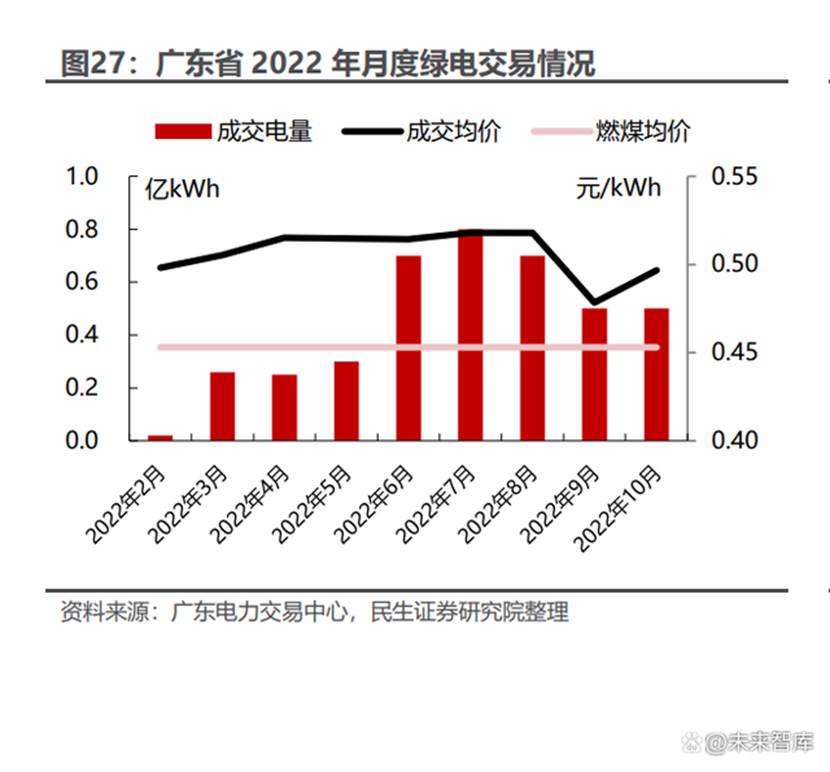 2022 年推動(dòng)綠電交易的相關(guān)政策持續(xù)加碼,有望進(jìn)一步擴(kuò)大綠電交易需求。 2022 年 1 月,國(guó)家發(fā)改委、國(guó)家能源局聯(lián)合發(fā)布《關(guān)于加快建設(shè)全國(guó)統(tǒng) 一電力市場(chǎng)體系的指導(dǎo)意見》(發(fā)改體改〔2022〕118 號(hào)),《意見》將“探索開展綠色電力交易”單列于“構(gòu)建適應(yīng)新型電力系統(tǒng)的市場(chǎng)機(jī)制”項(xiàng)下, 指出應(yīng)引導(dǎo)有需求的用戶直接購(gòu)買綠色電力,做好綠色電力交易與綠證 交易、碳排放權(quán)交易的有效銜接。 2022 年 1 月,國(guó)家發(fā)改委等 7 部委聯(lián)合發(fā)布《促進(jìn)綠色消費(fèi)實(shí)施方案》 (發(fā)改就業(yè)〔2022〕107 號(hào)),《方案》指出,要引導(dǎo)用戶簽訂綠色電力 交易合同,并在中長(zhǎng)期交易合同中單列,加強(qiáng)高耗能企業(yè)使用綠色電力的 剛性約束,且明確提出了建立綠色電力交易與可再生能源消納責(zé)任權(quán)重 掛鉤機(jī)制。 2022 年 1 月、5 月,廣州電力交易中心、北京電力交易中心相繼印發(fā)《南 方區(qū)域綠色電力交易規(guī)則(試行)》(廣州交易〔2022〕15 號(hào))、《北京電 力交易中心綠色電力交易實(shí)施細(xì)則》(京電交市〔2022〕24 號(hào))。《規(guī)則》 強(qiáng)調(diào),綠色電力交易主要包括省內(nèi)綠色電力交易和省間綠色電力交易;價(jià) 格方面,綠色電力交易價(jià)格由市場(chǎng)主體通過(guò)雙邊協(xié)商、掛牌交易等方式形 成;綠色電力交易價(jià)格應(yīng)充分體現(xiàn)綠色電力的電能價(jià)值和環(huán)境價(jià)值,原則 上市場(chǎng)主體應(yīng)分別明確電能量?jī)r(jià)格與綠色環(huán)境權(quán)益價(jià)格。