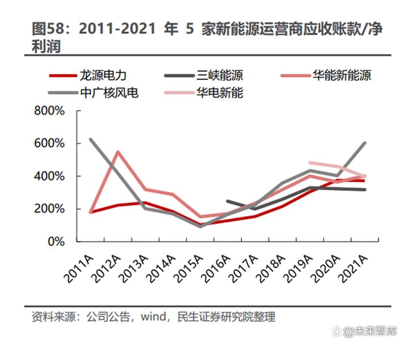 對(duì)比各年度期末應(yīng)收賬款余額和全年凈利潤(rùn)、營(yíng)業(yè)收入、經(jīng)營(yíng)凈現(xiàn)金流以及期末凈資產(chǎn),可以發(fā)現(xiàn)應(yīng)收賬款對(duì)企業(yè)經(jīng)營(yíng)造成了影響。同樣以這 6 家公司為例: 期末應(yīng)收賬款/當(dāng)年凈利潤(rùn):6 家公司在 2021 年度的比值均在 300%以 上,最高的是大唐新能源,達(dá)到了 9 倍;2016-2021 年均值均超過(guò) 250%, 大唐新能源接近 9.5 倍。 期末應(yīng)收賬款/當(dāng)年?duì)I業(yè)收入:除龍?jiān)措娏ν猓渌?/span> 5 家公司在 2021 年 度的比值均在 100%以上,即期末應(yīng)收賬款大于全年?duì)I業(yè)收入;而 2016- 2021 年均值也都接近 100%上下。龍?jiān)措娏Φ谋戎递^低,主要是因?yàn)槠?/span> 有一定體量的裝機(jī)是火電,營(yíng)收中沒(méi)有補(bǔ)貼部分。 期末應(yīng)收賬款/當(dāng)年經(jīng)營(yíng)凈現(xiàn)金流:6 家公司在 2021 年度的比值在 150% 以上,除龍?jiān)措娏ν猓溆?/span> 5 家甚至在 200%以上;2016-2021 年均值 基本在 1 倍以上,華電新能甚至超過(guò) 2 倍。 期末應(yīng)收賬款/期末凈資產(chǎn):6 家公司在 2021 年度的比值在 25%以上, 華能新能源、大唐新能源、華電新能超過(guò) 50%;2016-2020 年均值在 20% 以上。