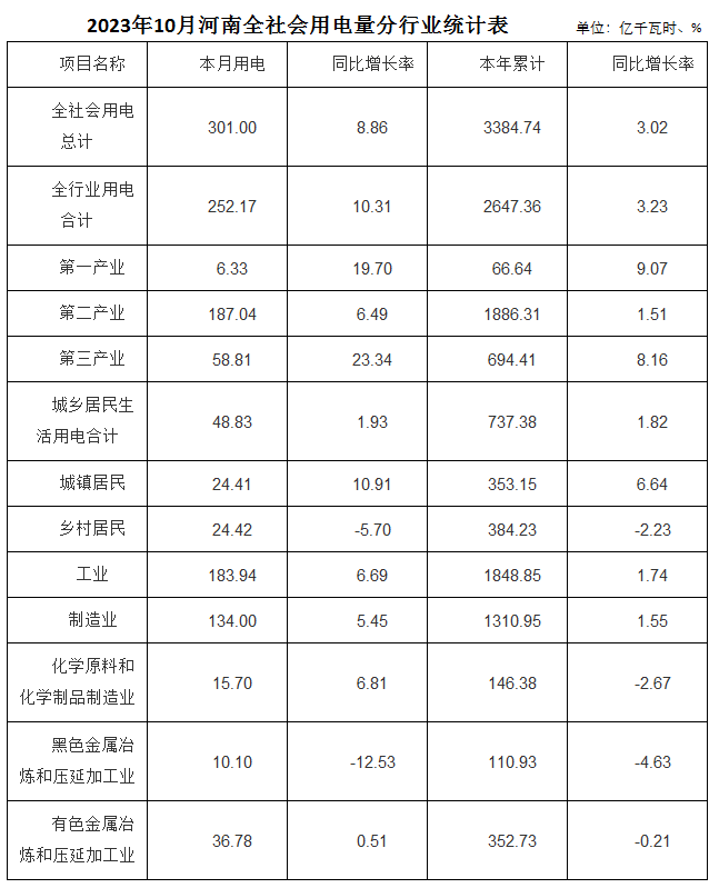 國家能源局河南監管辦公室11月21日發布數據顯示,2023年10月,河南省全省全社會用電量301億千瓦時,同比增加8.86%;1-10月累計用電量3384.74億千瓦時,同比增加3.02%。