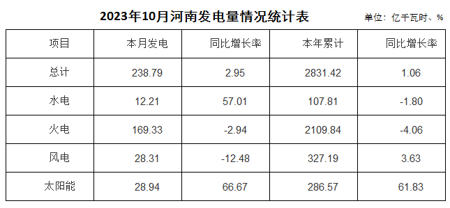 發電量方面,10月份全省發電量238.79億千瓦時,同比增加2.95%;1-10月累計發電量2831.42億千瓦時,同比增加1.06%。