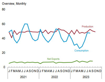 11月27日,美國能源信息署(EIA)發布最新《月度能源回顧》顯示,2023年10月份,美國煤炭產量為4907.4萬短噸(4451.92萬噸),較上年同期的5133.2萬短噸下降4.4%,較前一月的5020.3萬短噸下降2.25%。