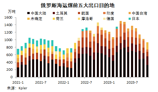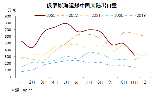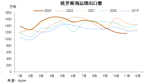 Kpler船舶追蹤數據顯示,2023年11月份,俄羅斯海運煤出口量1168.73萬噸,環比降3.10%,連續第四月環比下降,同比降21.02%。